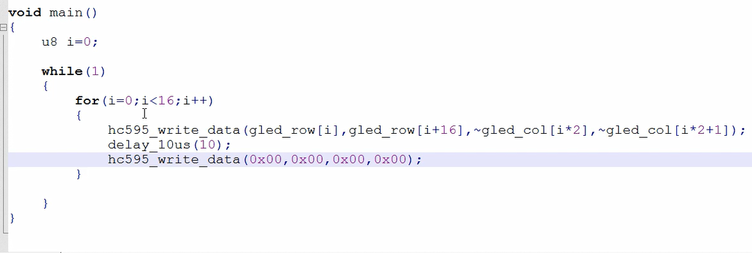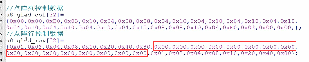 u8 gled_cols[8]={0x7f,0xbf,0xdf,0xef,0xf7,0xfb,0xfd,0xfe};//点阵列