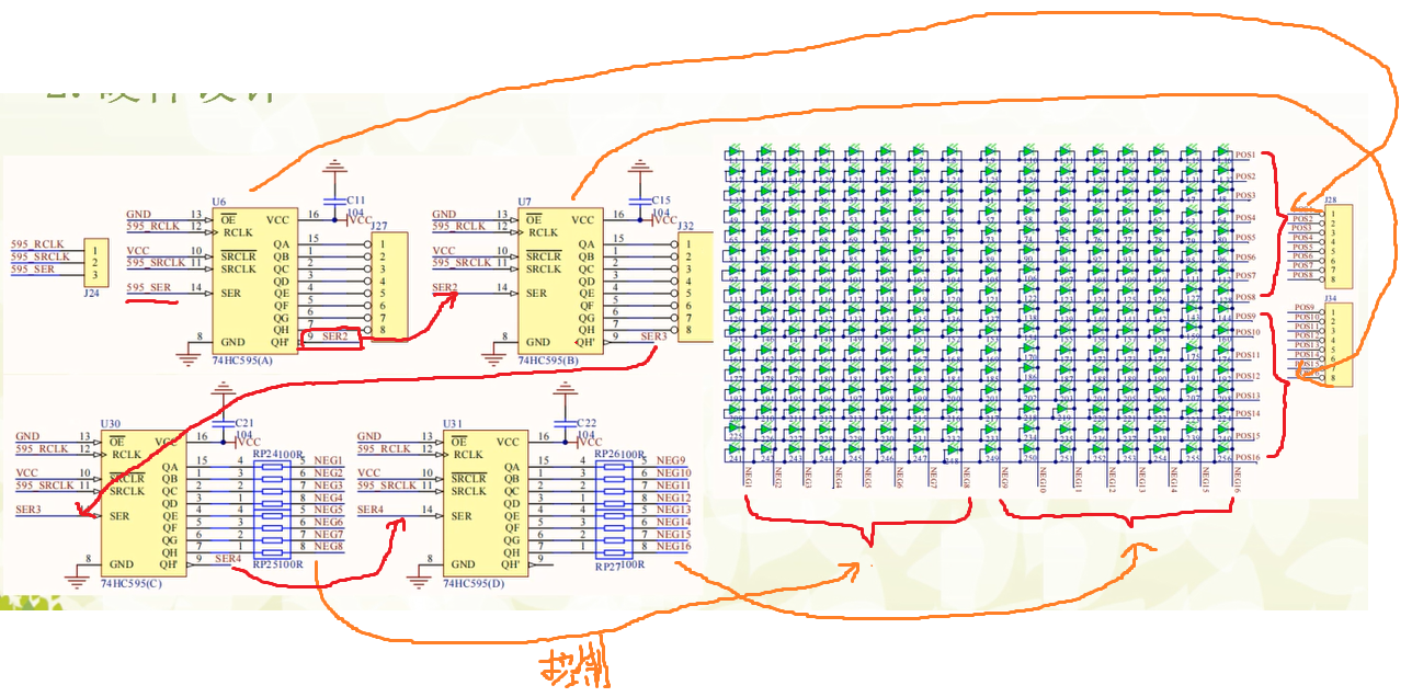 4片74HC595芯片,数据传入是 第一个字节最终传到第4片,第二个字节最终传到第3片,第三个字节最终传到第2片,第四个字节最终传到第1片上。(因为第一片8位满了后再传入的就会把前面的挤出去)