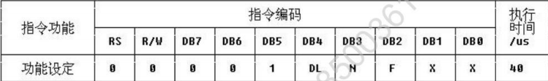 设定数据总线位数、显示的行数及字型。DL:0=数据总线为 4 位 1=数据总线为 8 位