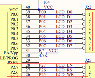 从上图中可知,LCD1602 的 8 位数据口 DB0-DB7 与单片机的 P0.0-P0.7 管脚连接,LCD1602 的 RS、RW、E 脚与单片机的 P2.6、P2.5、P2.7 管脚连接。RJ1是一个电位器,用来调节 LCD1602 对比度即显示亮度。