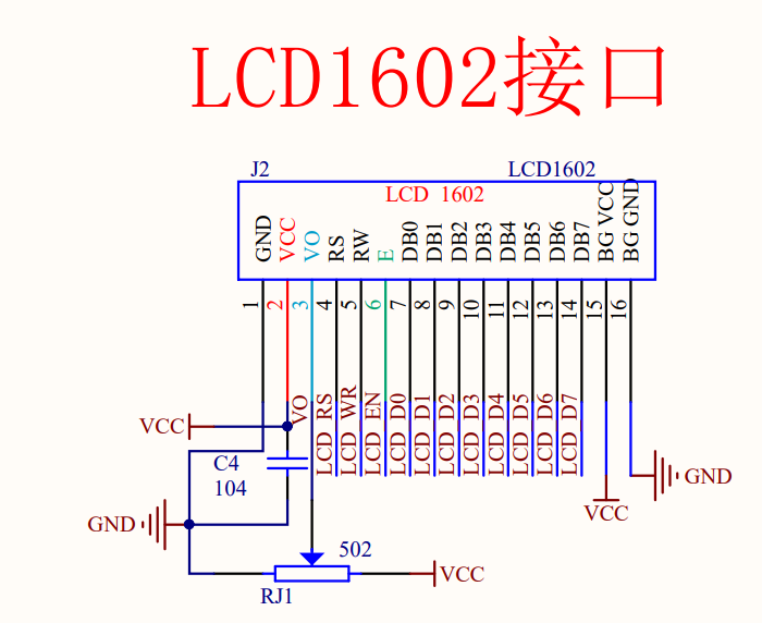 VL)液晶显示偏压信号,用于调整 LCD1602 的显示对比度,一般会外接电位器用以调整偏压信号,注意 `此脚电压为 0 时可以得到最强的对比度