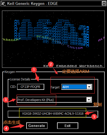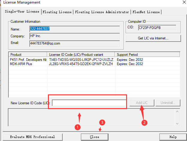 - 然后打开 Keil MDK,打开刚刚的 License Management 复制 ID 到破解工具那生成秘钥然后激活即可