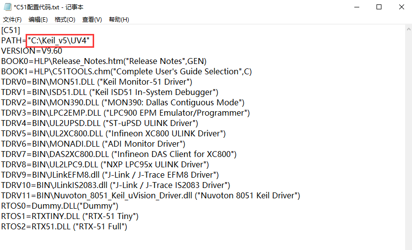 - 然后把之前 MDK-C51解压后的 C51配置代码.txt 用记事本打开,修改 PATH的路径为你 Keil MDK 的安装目录(就是刚刚的"文件所在位置")